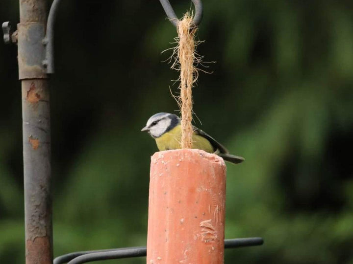 Our suet rolls feeders have been specifically designed to hang anywhere. The bottom of the roll is made up of a natural coconut shell, the jute handle runs all the way through the roll with the handle at the top. Simply hang this from a branch, tree hook or feeding station.