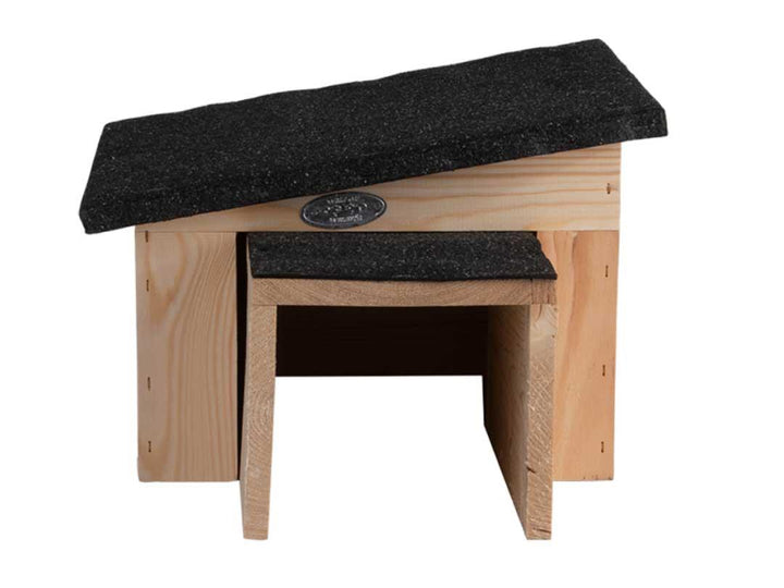 It is essential the construction is sturdy enough to prevent predators disturbing it . This clever designed nest has an extendable entrance to prevent dogs or badgers from reaching inside . The wood is 100% FSC with a water proof felt roof.